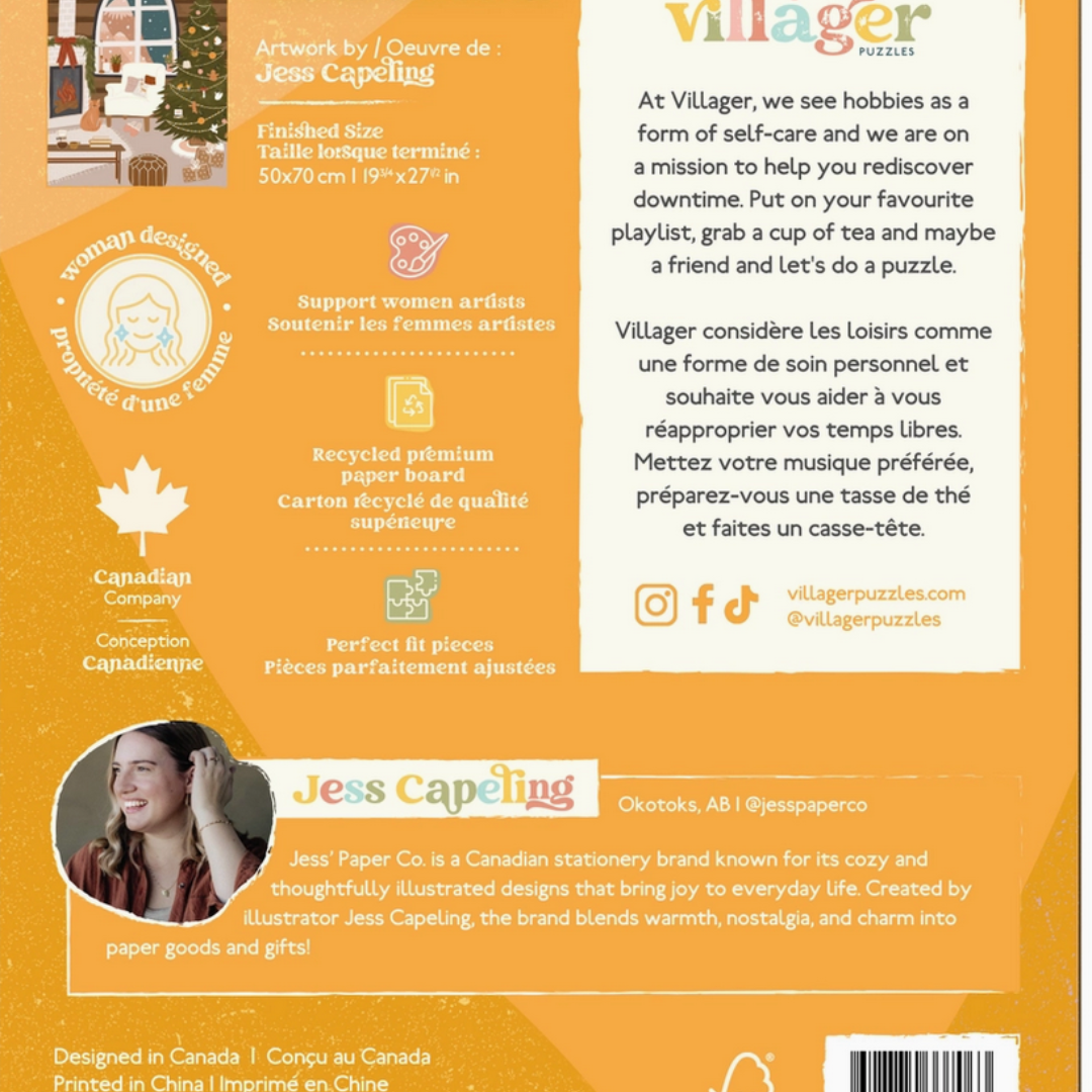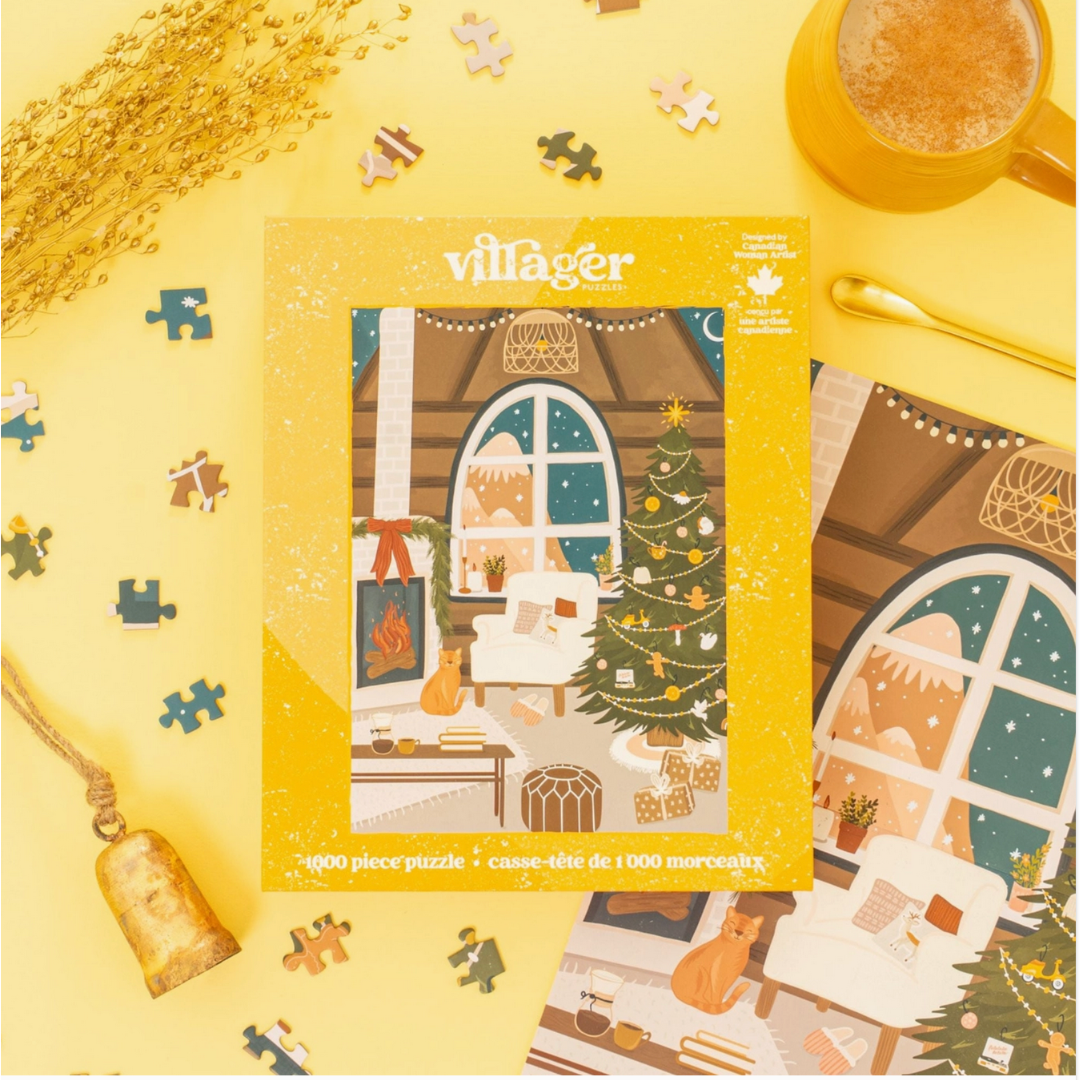 Bring the warmth of a Canadian Christmas to your shelves with this cozy puzzle featuring a wood-paneled cabin, a crackling fire, and a beautifully decorated Christmas tree. Designed by Alberta artist Jess Capeling of Jess’ Paper Co, this puzzle captures the comforts of home during the holidays in a modern retro style. Ideal for seasonal displays, gift guides, and holiday décor pairings. A thoughtful gift for puzzle lovers and anyone who adores the cozy magic of Christmas at home.
